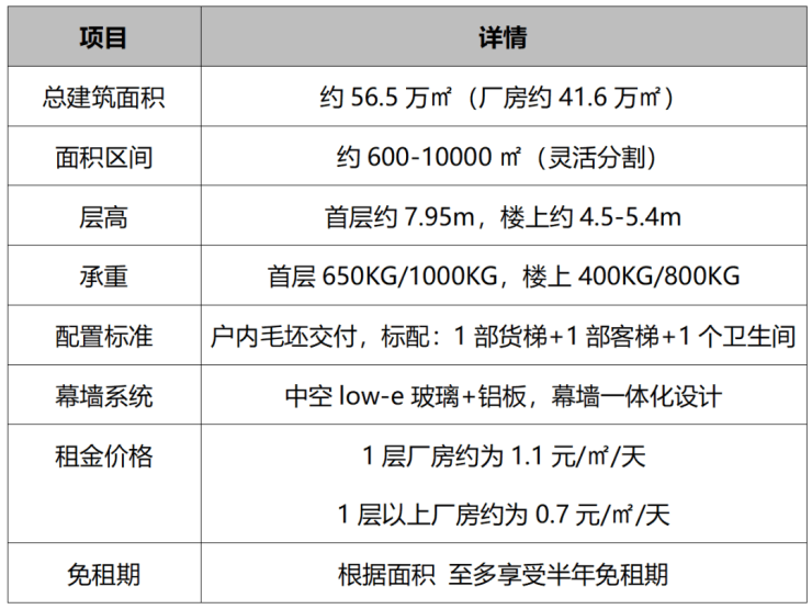 【产业政策】:最高180天免租期、车位与宿舍使用权政策、设备补贴、研发费用补助、金融扶持、创业项目支持等。