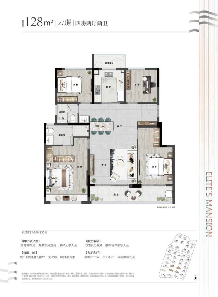 若想要空间更加阔绰,多孩家庭、三代同堂改善家庭,亦可选择观澜云庭建面约128㎡“四叶草”户型: