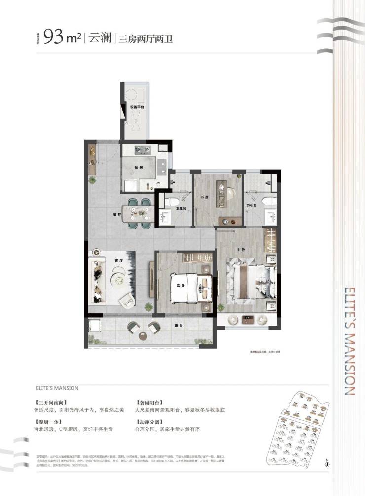 三开间朝南,引阳光清风入室;U型厨房与餐厨一体设计,让烹饪成为乐趣;更有奢阔南向阳台与动静分区的布局,确保家庭生活的井然有序与私密互不干扰。