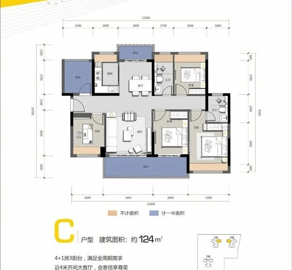 (2)建面约115平;全明通透格局,三面采光 奢阔餐客通厅,开阔实用空间 3阳台配置,约6.5米阔绰大阳台 主卧套房独卫设计,舒适
