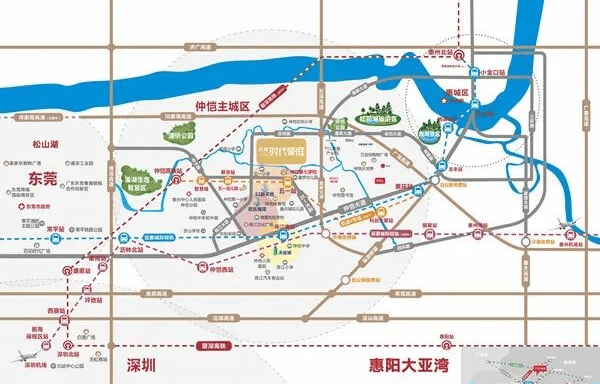 6、【四通八达】近拥 无缝深莞 紧邻两大城轨站点,交通路网发达,半小时速通深莞 (1)一高铁(赣深高铁)-->【项目距仲恺站约5.7公里】 1高铁,是指赣深高铁,赣深高铁起于江西赣州,设有仲恺站,1站到东莞,2站就到深圳,接广深港高铁可直达九龙;2021年12月已经通车。(2)双城轨莞惠城轨、深惠城际(规划中) 双城轨是指已开通的莞惠城轨和规划中的深惠城轨;莞惠城轨现已全部通车,区域内陈江南站,20分钟可通达东莞【项目距陈江南站2.5公里】