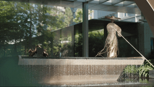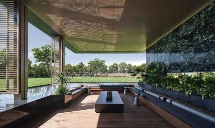 灵动的水帘后,便是“暮色光厅”的下沉式卡座,邻友可以在这里自在畅谈;原野映夕大草坪,是满眼盎然的绿意。在阳光、鲜氧与花草芬芳的包围中,城市的喧嚣已完美消融。