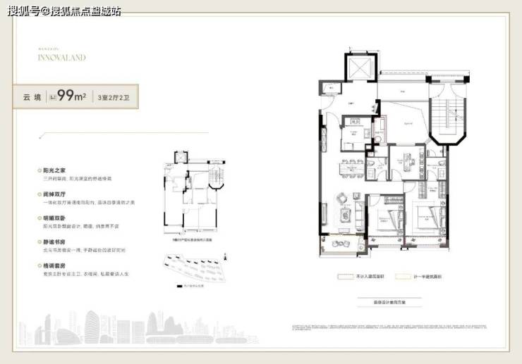 建面约99㎡云境,三室两卫设计,三开间朝南,一体化双厅连通南向阳台,阳光双卧飘窗设计,可以说把采光性能发挥到了极致。加大款的主卧套房,功能齐全、尺度宽裕,在百方面积领域“很能打”。