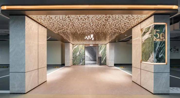 高端楼盘流行的“星空顶地库”,将艺术的仪式感赋予地下归家空间,头顶是璀璨的星空顶,环环相扣的流光,敬呈归家的高级度假感。