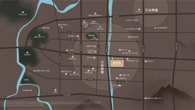 越望华府位于诸暨城东。作为城市发展新门户,城东分为中央商务区、新城居住区、休闲旅游区、创意工业区、高湖生态观光旅游区及弹性发展区六大功能区块,将打造成诸暨政治、经济、文化新中心。项目周边配套齐全,生活便利,交通便捷,环境优越,是城东核芯住区难得的宝地,前景与资源,皆遥遥领先。