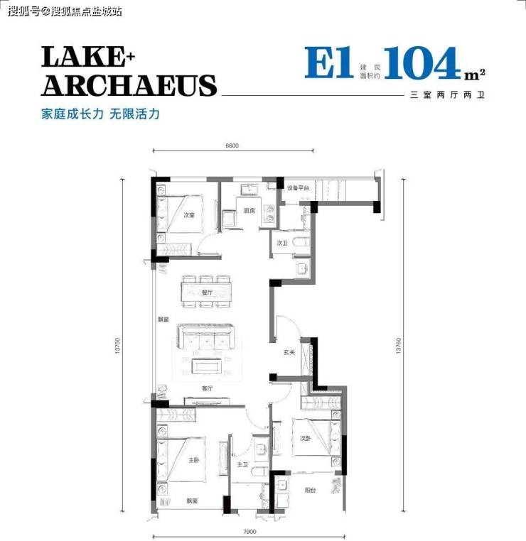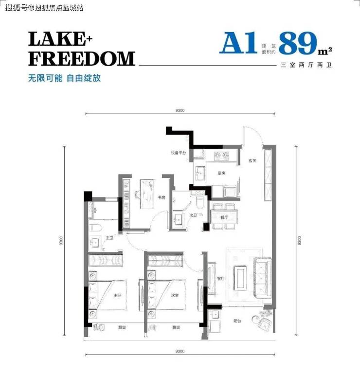 建面约98㎡户型:三室两厅两卫洋房夹边套,南北通透,户型正气。
