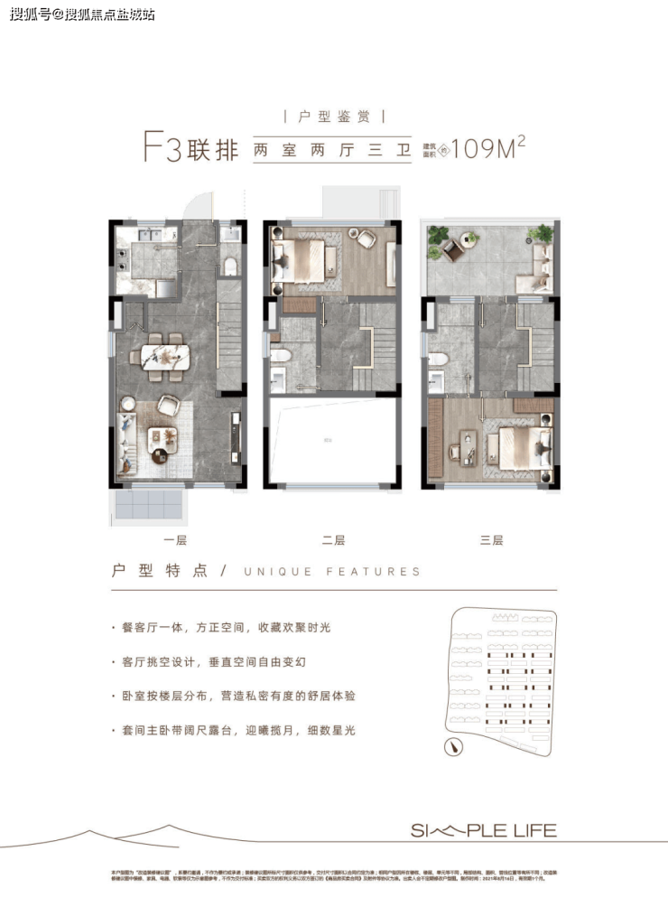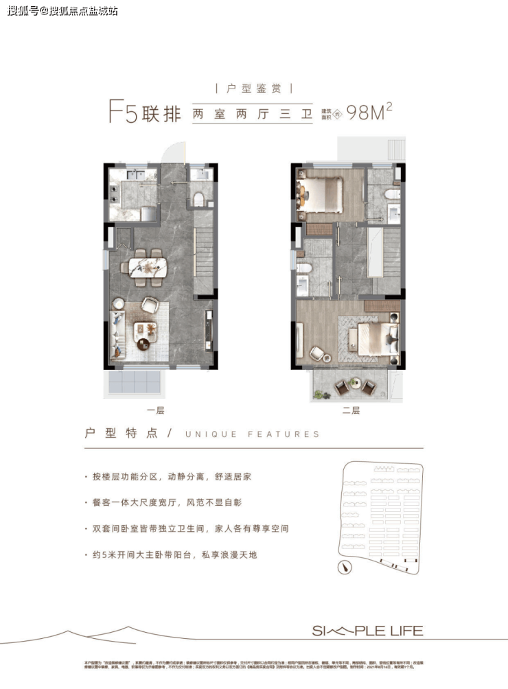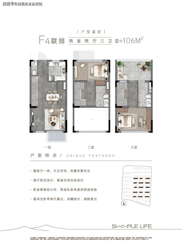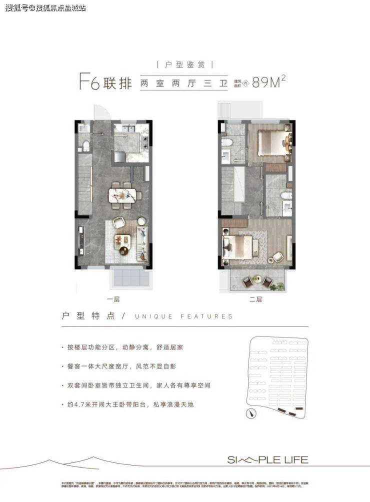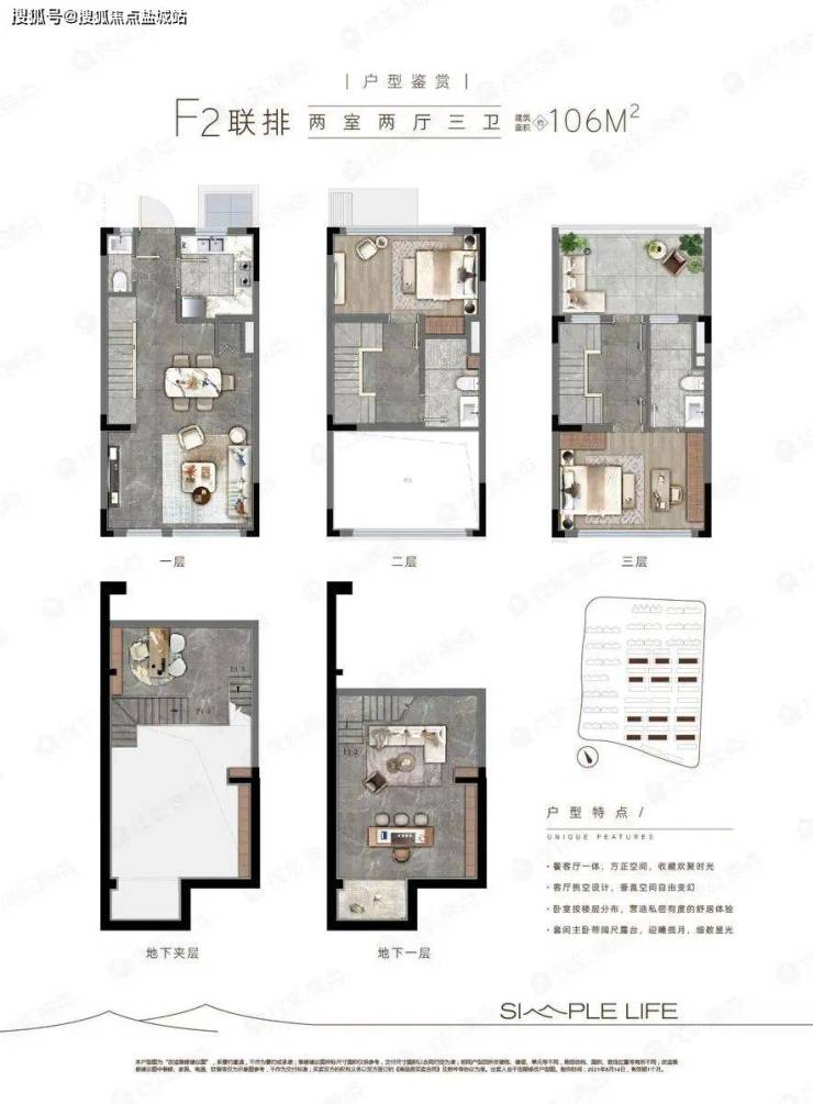 项目合计47幢楼,其中洋房12幢554套,联排33幢301套,项目整体分两批次推出,总计855套。采用人车分流,即保证社区整体设计的美观,又保证业主的安全性,车位有920个,做到1:1的比例。