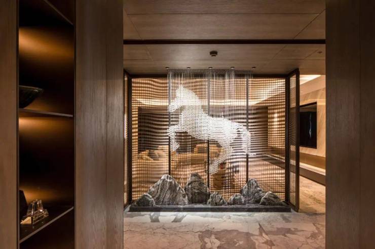 迪凯金座的样板房,同样是个充满隐喻的世界。以约465㎡户型为例,入口玄关处是数千颗巴西水晶拼成的白马,高度足有一米多。