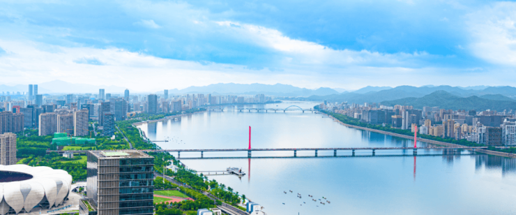 另一侧,奥体场馆和国博中心镶在窗前;目光向西,钱塘江绵延10公里,六和塔、西湖群山影影绰绰……