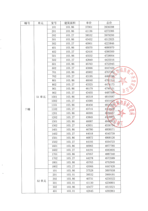 一房一价表如下