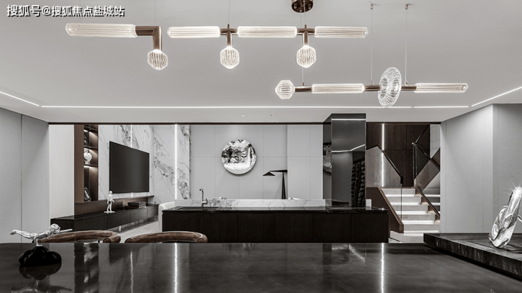 餐厅 厨房与楼梯间,设立了开放的中岛台,形成视觉隔断,在增添功能性的同时,也流露出设计师严谨的美学思考,以及对空间节奏的把控!沿梯下行楼梯利用灯光,呈现出轻盈的悬浮感,夹层作为阅读空间延续了整体色调,在黑白之中求得平衡 不张扬 也不喧闹,弧形沙发和圆形茶几带来的包围感!