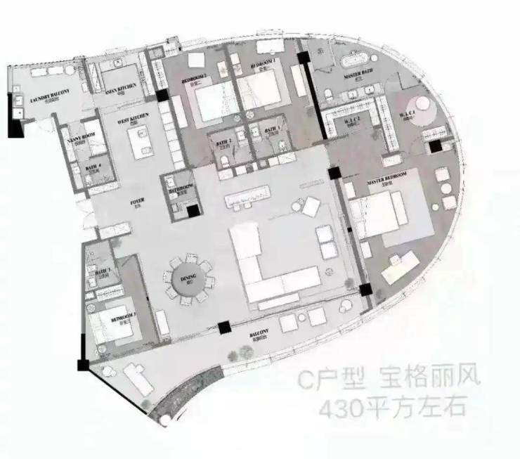 户型面积 约430-450㎡大平层,4房+1房2厅6卫配置12