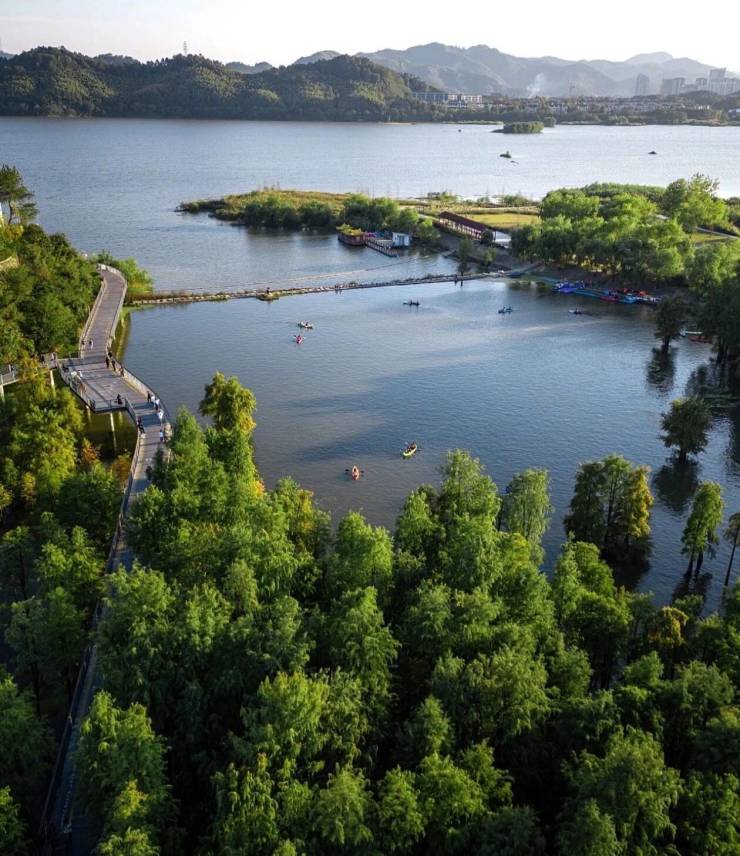 约 64.5km2青山湖国家森林公园,水域面积是西湖的 1.6 倍,森林覆盖率高达约 82%,约 100 万方国内罕见水上森林,被称 为“杭州版亚马逊”;年内负氧离子农都 3088 个/m3,超世界卫生组织清新空气标准 2 倍;在湖山绵延中,慢跑/骑行/垂钓 /泛舟,随时享受一场原地旅行。
