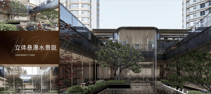 下沉式环幕庭院,跌水景观环绕,池底仿黑金砂与宝石晶片闪烁,点缀百余灯珠,师法“琉璃水光” 形意,糅合视听五感,打造全浸式立体园境,天工巧夺,嘉定未见。