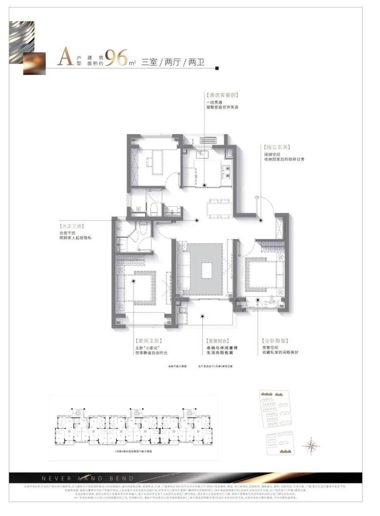 如建面约96㎡户型,性价比极高,是一个低总价上车3房的优质选择。经典飞机户型+三房两厅两卫设计,照顾家人的起居隐私;更有客餐厨一体化贯通设计,使得空间不设限更显大;主卧“小家化”,悦享静谧自由生活;进门处设置独立玄关空间,增加收纳的同时,也保护了业主隐私。