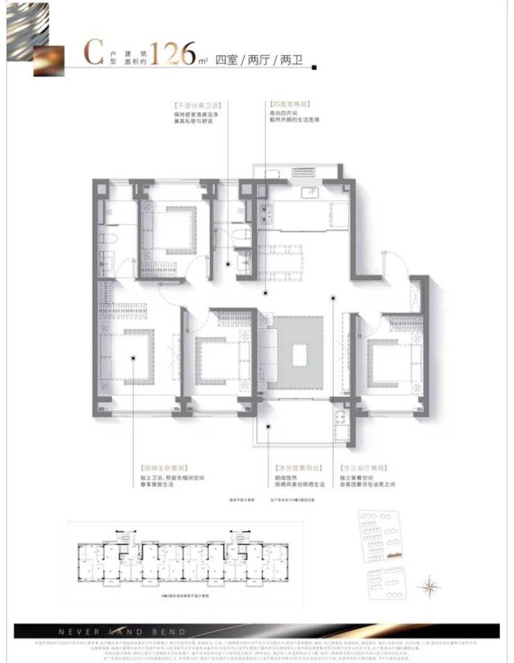 建面约126㎡四房两厅两卫,更大限度保留了南向房间,四开间朝南,并且是LDKG一体化设计,全飘窗设计,更大大增加了室内尺度感和实用空间。