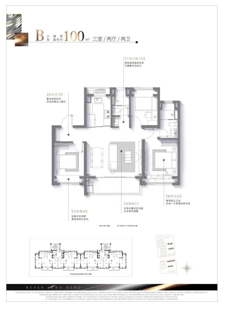 而建面约100㎡的三房两厅两卫户型,可以说是约96㎡3房的升级版,空间更加延展,整体横厅面宽约5.2米(轴中距),形成更大的南向采光面,且搭配南向观景阳台,直接做到了3.5面宽朝南,这在同类产品中是比较少见的。