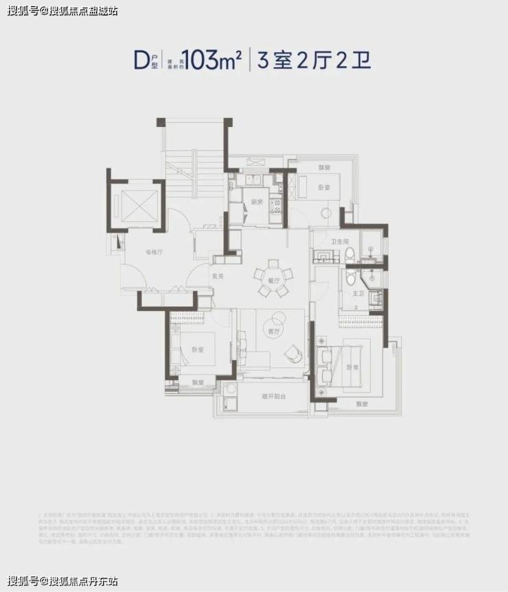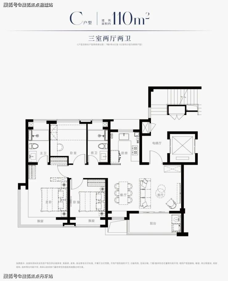 此户型在103㎡户型的基础上,将南向主卧、北向次卧均升级了约270°转角飘窗设计,采光视野及美观性都得到了极大提升。建面约110㎡3房2厅2卫
