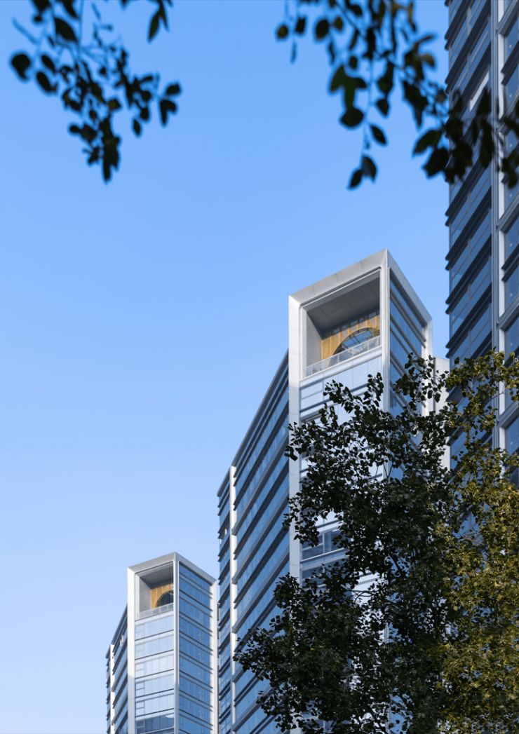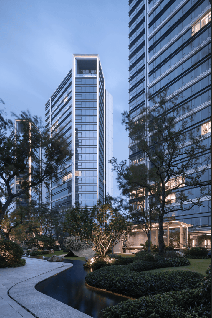 10幢标志封面,主力户型建面约330㎡高定私域,项目以立体空中场域的设计理念打造,大面积玻璃、建筑体块约45°设计,以约270°寰境一揽奥体盛景与都市风光。