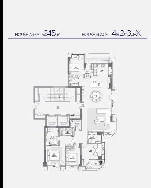 建筑面积约276㎡全功能户型,4+1房配置,带独立储藏间和家政间,主卧双衣帽间+双台盆,可根据家庭结构更改室内功能性,客餐厅阳台一体化,空间超级宽敞、方正,可以是主人社交主场,也可轻松承载House Party,作为边套户型,270°采光和视野赋予该户型更强的尊贵感。