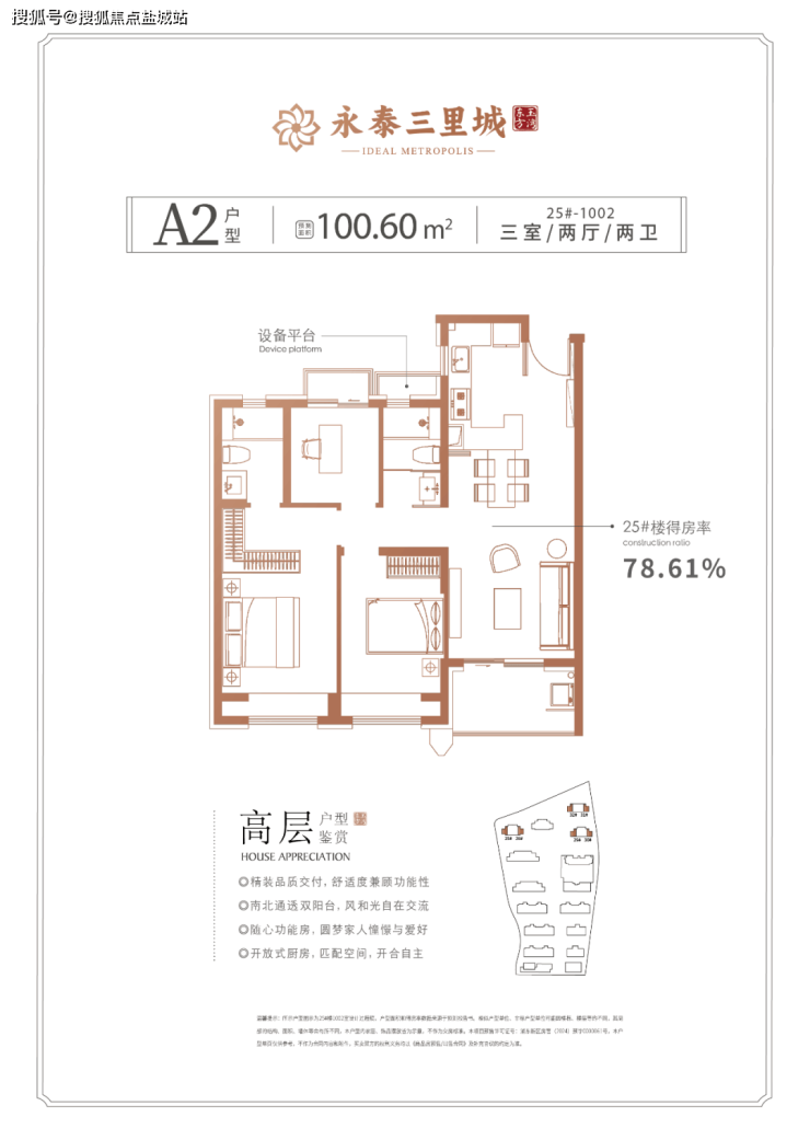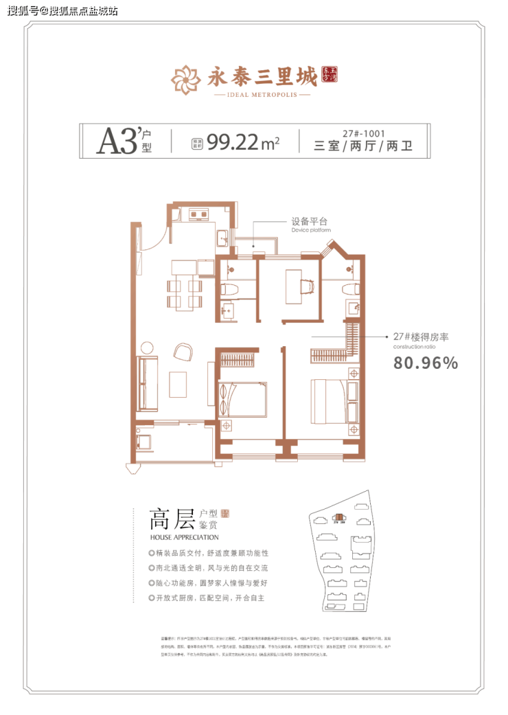 这3个户型三开间朝南、室内“朝南2飘窗+1阳台”、再加上“2卫”、“动静分离”的设计,不管是采光、视野、通风、私密性,还是实用性都十分出色。