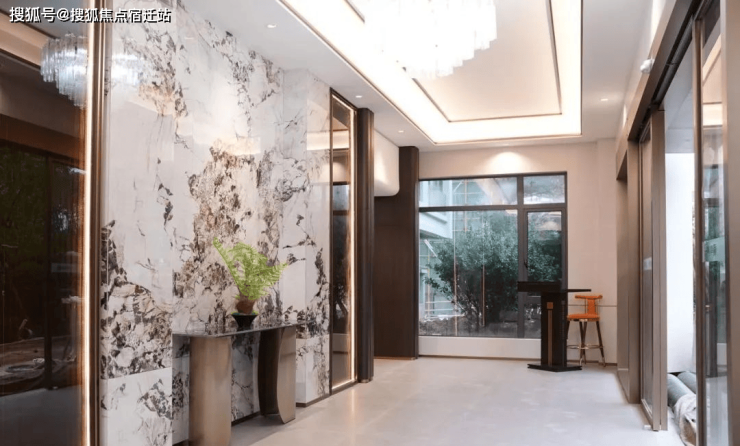 同时,采用地上、地下双入户精装大堂,地下单元入口处设计了灵感源自劳斯莱斯星空顶的星空穹顶车马厅,出入口采用挑空设计、木纹铝方通吊顶、天然石墙面,营造出尊贵的归家体验。