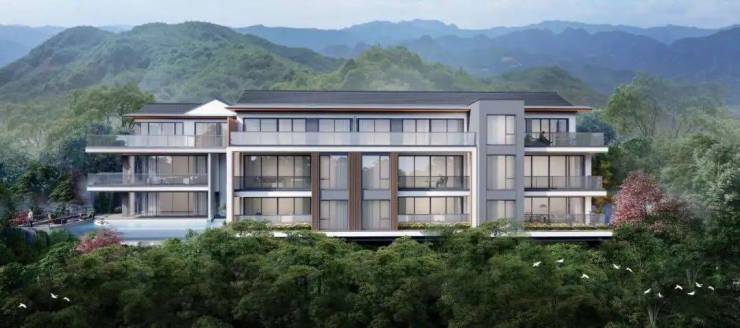以通透性和度假感为呈现特色,云澜山居的建筑采用传统与现代结合的新中式风格,以几何线框勾勒极简美学立面,水平向则用洗练的线条结合长坡屋面,辅以大面积通透玻璃,既完美传承了中式韵味,又更好的融于自然山境,让秀美山林如同嵌入建筑的诗意画卷。