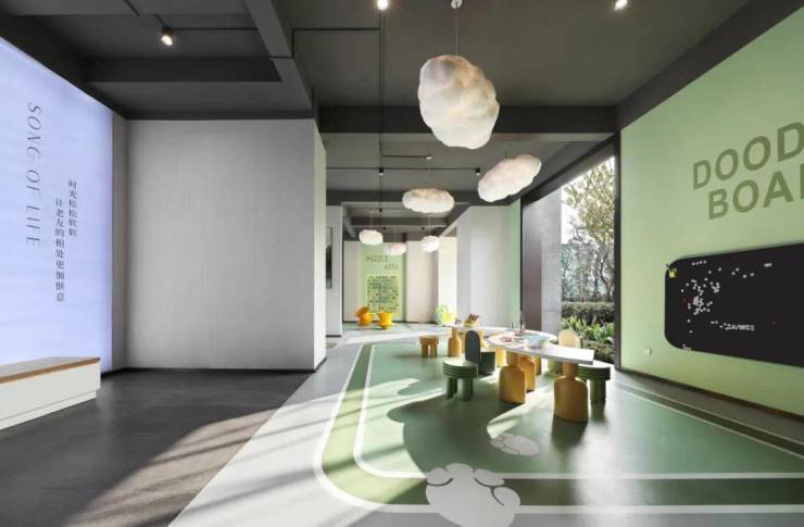 而在架空层空间,丰富的主题区域,让业主随时下楼体验。台球桌上的技艺交流、休憩区的闲谈、童玩区的嬉闹,以及四点半课堂、运动区等,为生活更添丰盈内容。