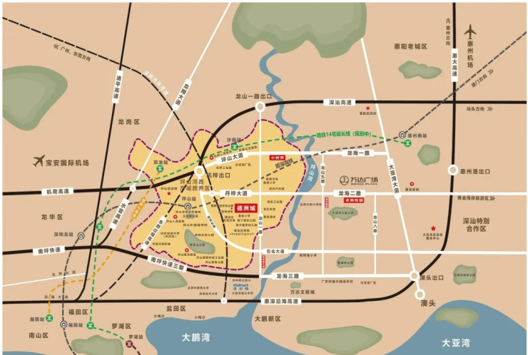 4.便捷交通网络:紧邻深圳坪山100米,龙山一路规划深汕高速白云出口,南坪三期规划龙山一路出口,外环高速接通丹梓大道,两高一快速的规划进一步拉近德洲城与深圳CBD的时间距离;