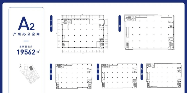 A1/A2区 产研办公空间A1建筑面积约14649.51㎡,A2建筑面积约19562.49㎡,总高5层。