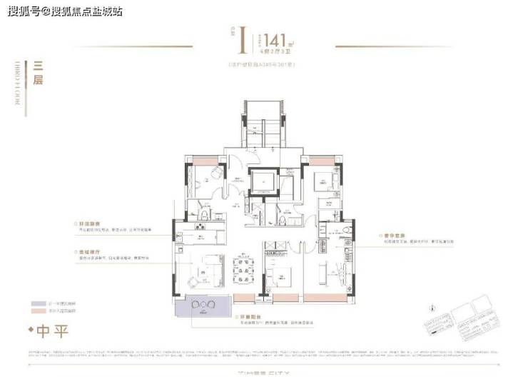 该户型四开间朝南四房配置,有两点很独特: