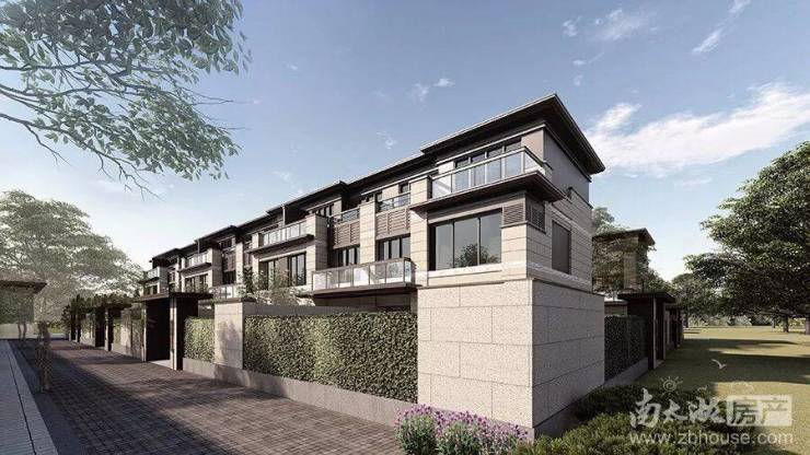 排屋产品的细节,采用新中式风格,南北双庭院入户,再加之大面积南北双向花园设计,入户皆景观。
