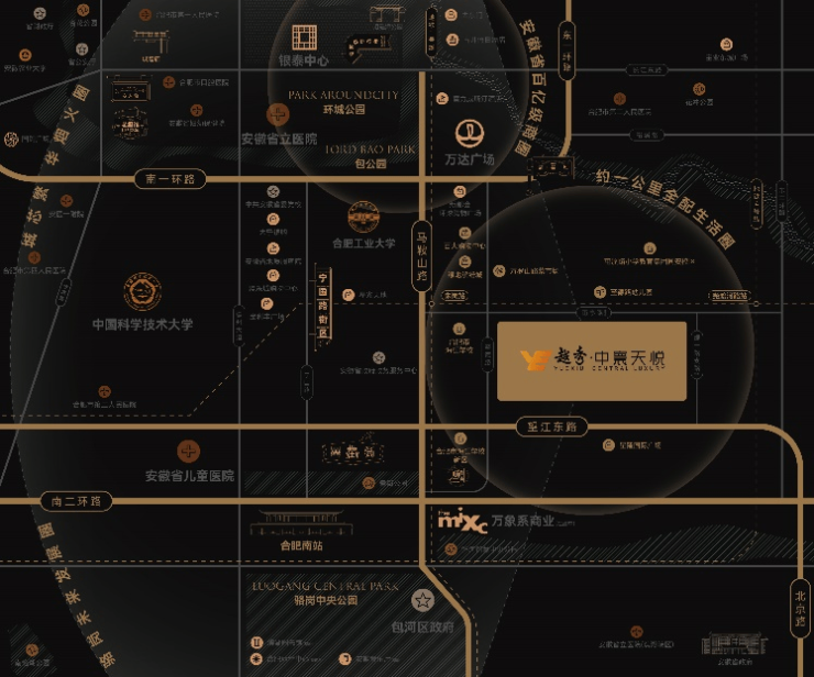 越秀・中寰天悦位于包河区二环内淝河板块,周边交通便捷,临近望江东路及东二环等多条主干道。商业配套成熟,生活氛围较为浓厚。书包为屯溪路小学+海顿中学(宣传)。片区多线地铁汇聚,但距离最近地铁1号线也有1.5公里。