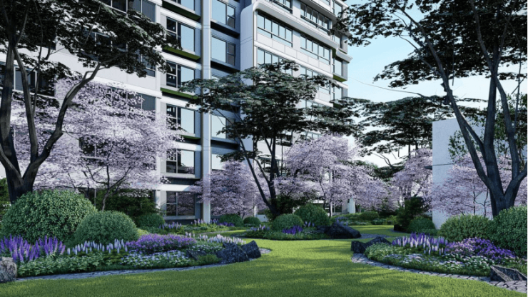 众禾嘉苑采用经典的中轴对称设计手法,社区内以中央景观轴+中央景观花园为核心,规划“一轴、一心、一环、五园”的景观布局,打造了美学会客厅,阳光大草坪,下沉式书吧、环形跑道和五个楼幢景观花园等多个主题景观组团,打造社区人性化、景观功能化、配套全龄化的全维度生态住宅。