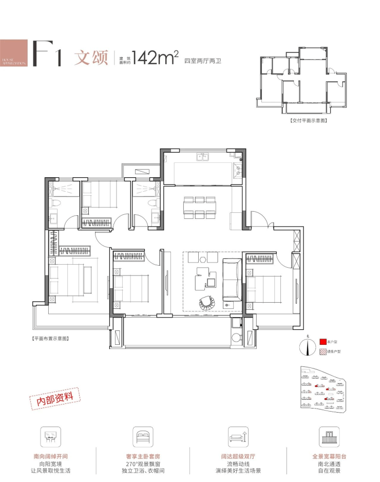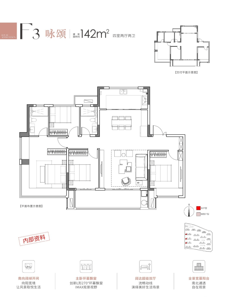 ▼建面约142㎡:4房2厅2卫,全明设计,四房朝南,视野开阔,宽幕飘窗+独立明卫,尽享生活仪式感。南向约7.5米超大双阳台设计,提供了更多的生活场景选择,无论是生活还是诗与远方都能实现。