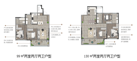玖园推出的产品是99 ㎡和130 ㎡的两居、三居的改善型康养产品,南向三面宽、联通型阳台、南北通透成为产品的典型特征;室内考虑轮椅回转空间、担架通行需要、大床变双床等可能,为每一个房间提供了足够的使用空间,保障了产品的使用弹性。玖园室内格外注重适老化和人性化细节,设置了入户置物挂钩、防滑防眩光的仿石地砖、下放式水槽台面、隔音门锁、内凹式台盆柜、拉绳报警器等103项适老化与人性化细节。