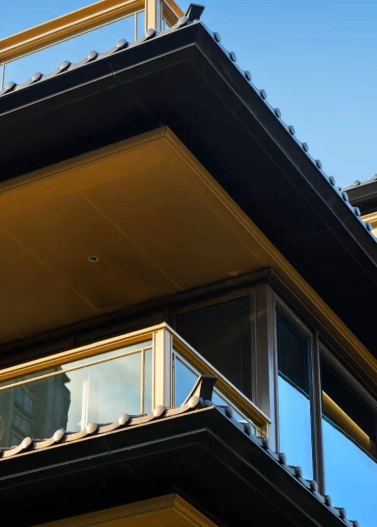 1.三重屋檐,代表天地人融合的东方宫殿最高等级,上檐、外檐、下檐三重结构,兼顾隐私同时,运用现代语汇转译东方符号。