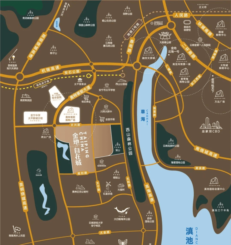 周边还有砂之船(昆明)奥特莱斯,距离项目约 2km,是一个约 37 万㎡大型集中的商业体,涵盖了衣食住行,能满足生活、娱乐、文化等需求。项目对面是新昆华医院,这是省级三甲医院在云南唯一的分院,已经在 17 年全面投入使用,方便家人看病就医。周边还有多个成熟的住宅圈,能为日后的生活提供便利。交通出行条件改善:太平新城距离昆明主城区直线距离约 16 公里,从昆明西收费站出去一公里就是太平新城。2020 年 5 月昆明至太平的过路费从 8 元降到了 1 元;石安公路扩建通车,避开了昆明西收费站,缩短了到达太平新城的出行时间和出行成本,也减小了碧鸡关和昆明西的通行压力,太平到主城的通行时间也缩短。