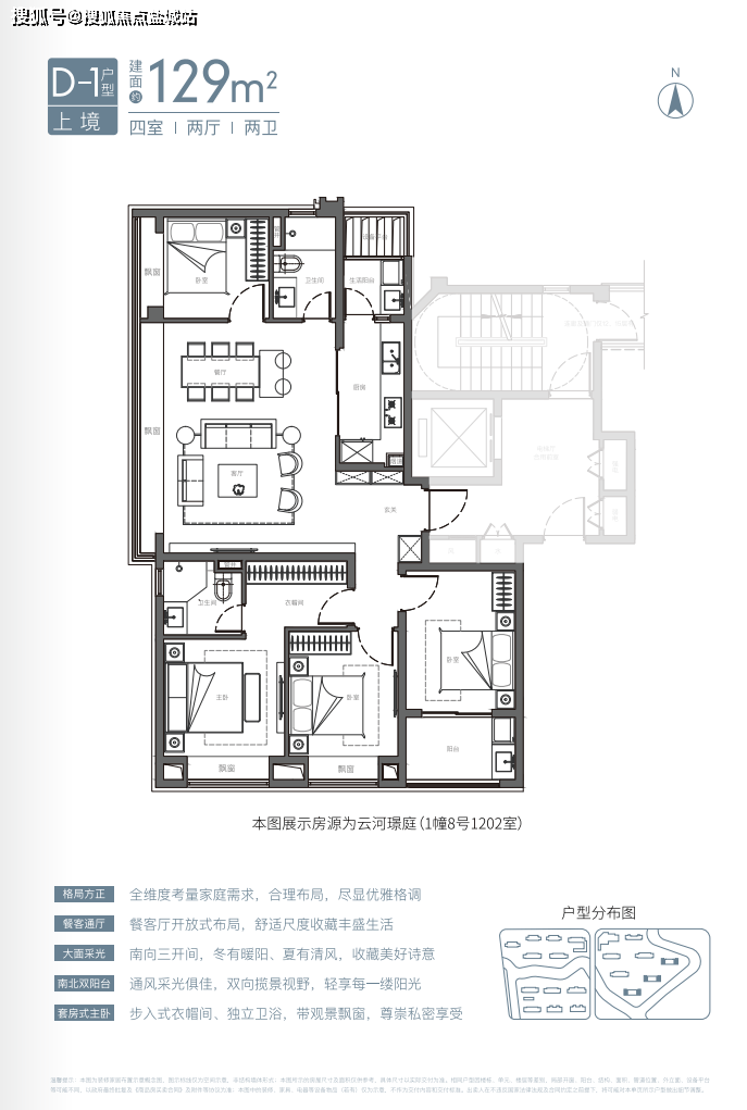 项目129平四房两厅两卫配置,功能齐全,满足终极置业需求;三开间朝南,向阳而居,6.1米侧厅布局,枕水而居,尽享滨水花园景观视野;开敞式书房,空间感升级,侧向飘窗,景观渗透更加充分。