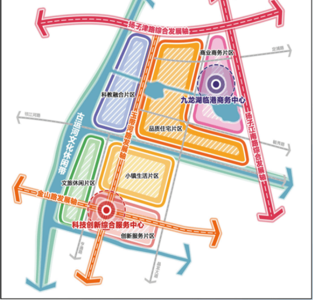 “四轴”:扬子津综合发展轴、扬子江南路综合发展轴、玉带河路发展轴、金山路发展轴;