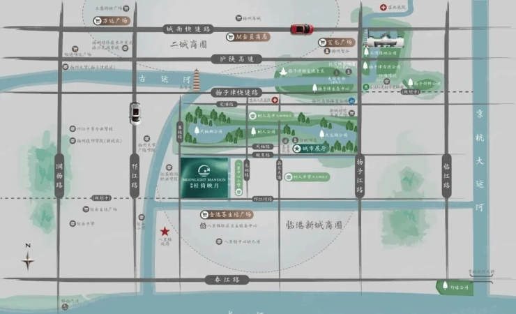 东至扬子江南路-邗江河-晶龙大道一线,南至宜城路,西至古运河,北至扬子津路,总用地面积约6.57平方公里。