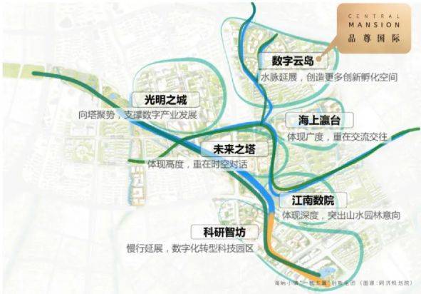 海纳小镇规划海上瀛台、未来之塔、江南数院、光明之城、数字云岛、科研智坊六大功能板块。