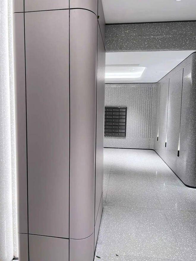另外,「品尊国际三期」所有的公共走道区域都采用龙骨加铝合金板,皮革样纹路的铝板面圆弧转角设计让老人和小孩完全不必担心磕碰的风险。这样的安全细节设计实在是太过人性化了。