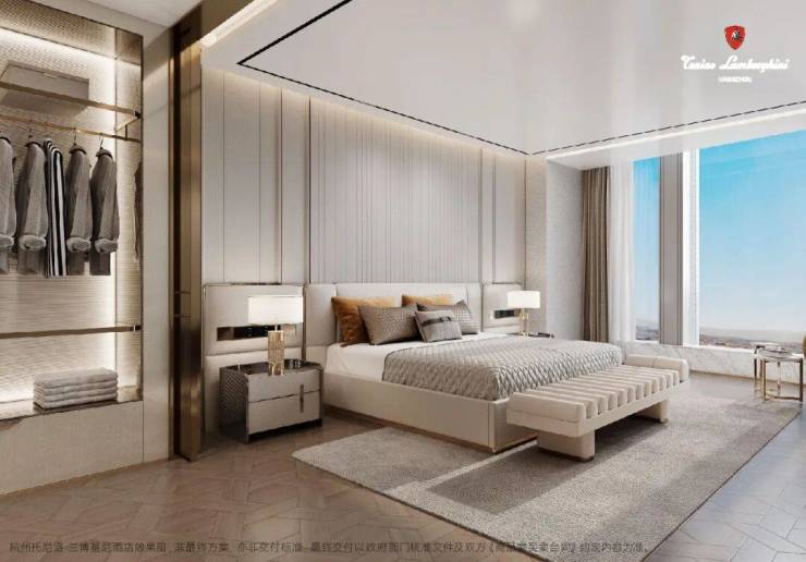 杭州托尼洛·兰博基尼行政公寓:产品设计首开建面约230-420㎡,精装交付(装修标准约1.8万/㎡)建面约230㎡参考总价800万起,3房3卫双主卧设计,约40㎡主卧奢配独立衣帽间。建面约420㎡,