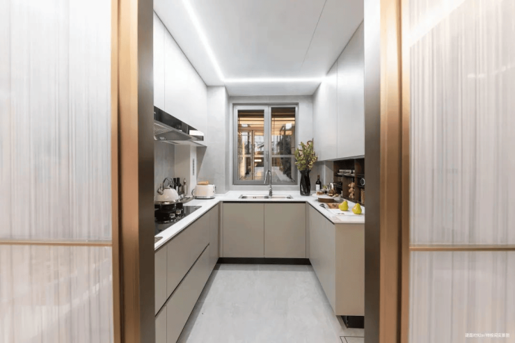 虹桥润璟建面约92㎡户型在厨房打造上完美展现了烹饪的仪式感与精致感。运用公元前1500年的玻璃拉丝工艺打造海派金属拉丝移门,让居者时刻品味海派美学。