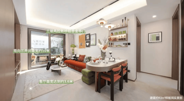 而且,建面约92㎡不仅户型设计更人性化,在空间尺度上更是突破了以往不足百平的设计,南向三开间面宽约10米,其中客厅面宽达到约3.6米,这一标准,以往只在约100平甚至更大户型里才能实现。虹桥润璟以优秀的产品力打造出满级空间,直接将户型卷出新维度。