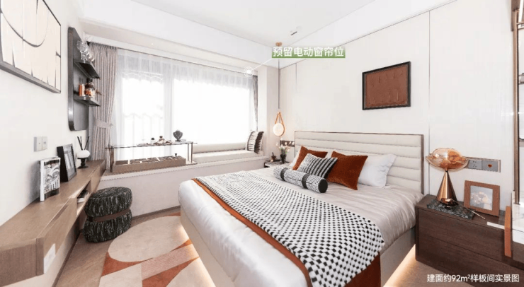 不止于此,在建面约92㎡户型中,还做了弧形阳台的设计,以海派弧形元素重构阳台空间,演绎海派美学精髓,纵享随心的无界风景。