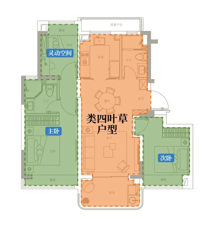 虹桥润璟建面约92㎡就属于典型的飞机户型,也是类四叶草户型,这样的空间设计不仅南北通透,空气更为流通。且卧室与卧室之间隔了一个客厅,与卧室相邻的户型相比较,休息环境更私密,非常符合与父母同住,既享有私密生活,又满足分而不离的居住诉求。