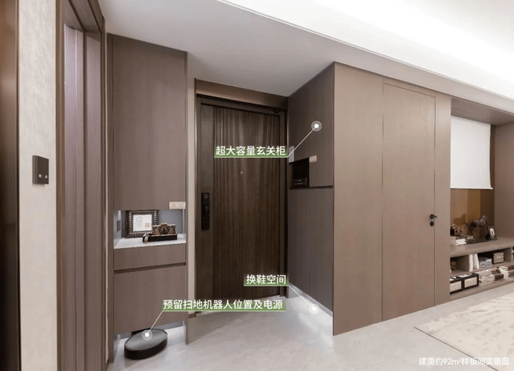 玄关作为归家动线的一环,特别定制了玄关柜,可以放下业主出入的必备物品,如换季的鞋子、雨伞等等,搭配贴心的换鞋空间,让出入更从容有序;同时预留扫地机器人位置及电源,隐藏设计不占空间,收纳有度,为更舒适的生活让步。