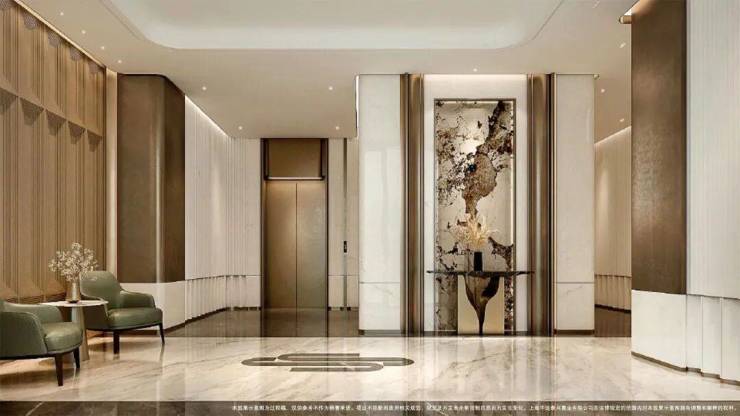 项目一楼设计星级入户大堂!挑高穹顶之下,天然石材与金属线条,交织出当代艺术馆般恢弘气度!